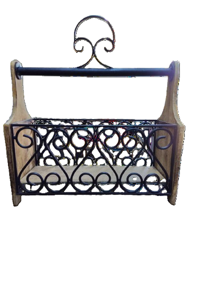 Ρουστίκ διακοσμητική θήκη με ξύλινες πλευρές και μεταλλικές λεπτομέρειες σε περίτεχνο σχέδιο. Ιδανική για αποθήκευση ή διακόσμηση σε vintage ή country στυλ. Μπορεί να χρησιμοποιηθεί ως θήκη για εφημερίδες, πετσέτες ή διακοσμητικά αντικείμενα.