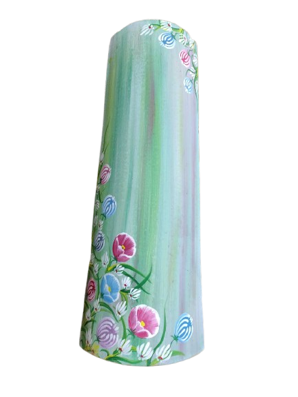 Εντυπωσιακό κεραμίδι με απαλή πράσινη βάση και ζωγραφιστά λουλούδια σε ροζ, μπλε και μωβ αποχρώσεις. Ιδανικό για διακόσμηση εσωτερικού χώρου.