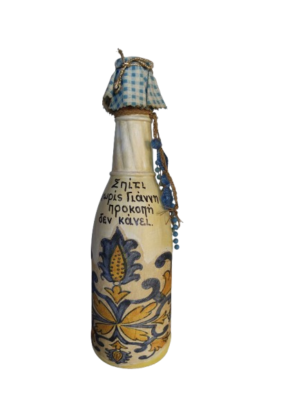 Ένα μπουκάλι που συνδυάζει ελληνική παράδοση, λαϊκή σοφία και χιούμορ! Διακοσμημένο με μπλε-κίτρινα παραδοσιακά μοτίβα, ύφασμα σε καρώ καπελάκι και τη φράση: