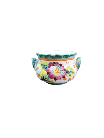 Διακοσμήστε τον χώρο σας με αυτό το εντυπωσιακό κεραμικό κασπώ, διακοσμημένο με ζωγραφιστά λουλούδια σε ζωηρά χρώματα και ανάγλυφα πλαϊνά χερούλια. Ιδανικό για εσωτερικούς ή εξωτερικούς χώρους, προσθέτει παραδοσιακή και χαρούμενη αισθητική.