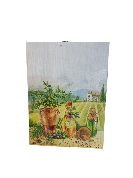 Αποπνέοντας άρωμα ελληνικής υπαίθρου, αυτή η ξύλινη διακοσμητική πινακίδα παρουσιάζει μια όμορφη σκηνή με ελαιόδεντρο, μπουκάλια ελαιολάδου, βότανα και παραδοσιακά αγροτικά στοιχεία. Ιδανική για κουζίνα ή τραπεζαρία, συνδυάζει τη ρουστίκ αισθητική με τη ζεστασιά της Μεσογείου.