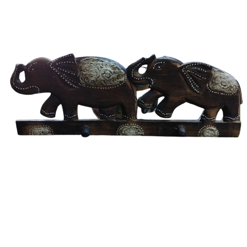 Διακοσμητική ξύλινη κρεμάστρα με δύο ανάγλυφους ελέφαντες σε σκούρο ξύλο και μεταλλικές λεπτομέρειες. Ιδανική για είσοδο, υπνοδωμάτιο ή παιδικό δωμάτιο.