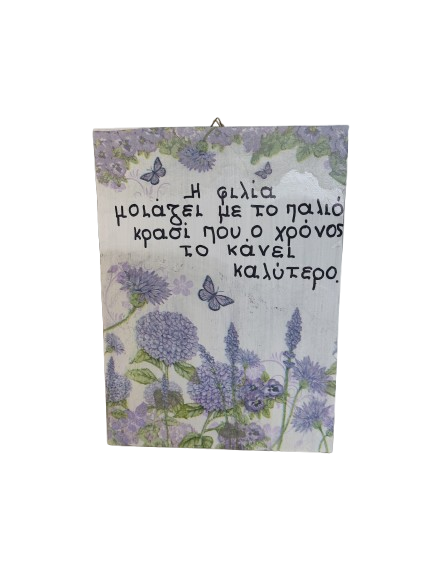Ξύλινη Πινακίδα με Ρητό για τη Φιλία κ Μωβ Λουλούδια