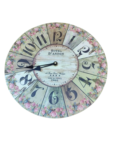 Ρολόι τοίχου με ρομαντικά λουλούδια και κλασικούς αριθμούς. Ιδανικό για vintage ή shabby chic διακόσμηση, προσφέροντας μια γλυκιά και ρετρό αίσθηση στον χώρο σας.